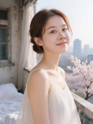 樱花氛围中的都市诗意,柔和光影勾勒清新面容,水彩风轻拟物质感,融合东亚美学与现代优雅,营造温柔浪漫的实景感。