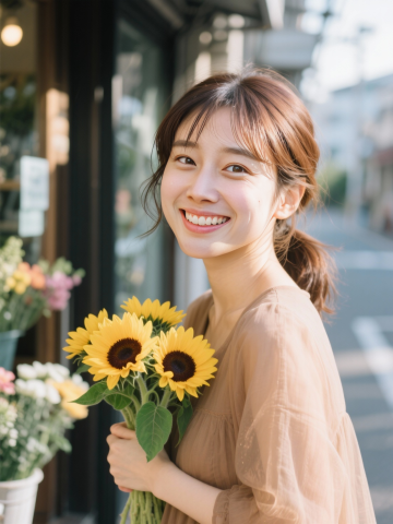 清新柔和的东亚风写真,水彩般的光影渲染出唯美文艺感,实景街景中少女手捧向日葵,笑容温暖,满溢舒适与自然之美。