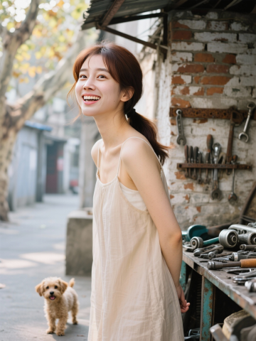 胶片风质感,东亚街头日常,质朴砖墙与旧工具铺陈生活气息,女孩笑靥如花,小狗相伴,温柔光影中流淌清新与文艺的暖意。