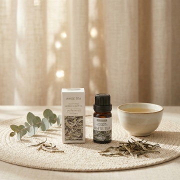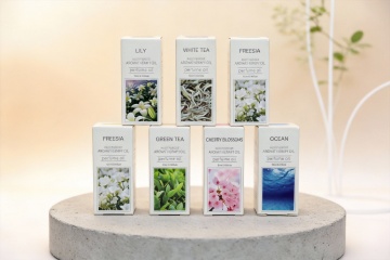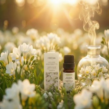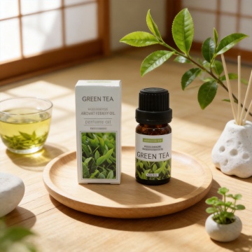 简约高级的产品展览场景,两个棕色玻璃精油瓶带有黑色瓶盖和白色标签,标签上有“Lemon Grass”字样,放置在米色几何造型展示台上,柔和的侧光投射出植物叶片的阴影,背景为温暖的米棕色渐变,整体呈现宁静自然的氛围,光影层次分明,质感细腻,极简主义风格,突出产品主体。