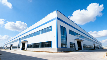 现代化工业场景,蓝色为主色调,清新明亮的光线,干净整洁的生产线,透明玻璃幕墙外是蓝天白云,绿色植物点缀在车间角落,机械臂精准运作,地面反光如镜,整体氛围充满科技感与希望