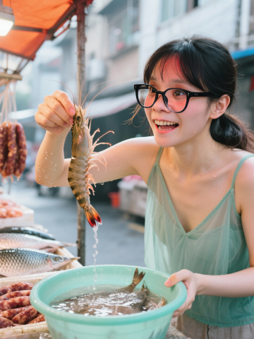 东亚风市集场景,水彩质感与胶片光影交融,重拟物手法呈现鲜活虾蟹,清新爽朗中透出趣味可爱,实景感十足的夏日烟火气。