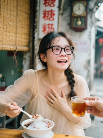 国潮风街巷中,少女品糖水笑语盈盈,胶片质感光影柔和,轻拟物设计勾勒质朴温馨,中式感与清新文艺交织。
