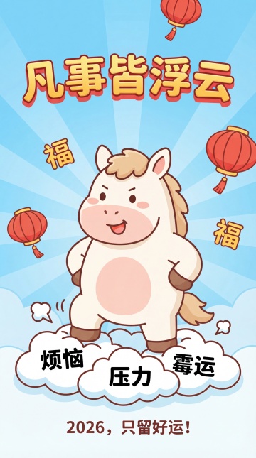插画风卡通独角兽踩碎烦恼云,鎏金文字闪耀喜庆,粒子特效点缀梦幻,红灯笼与福字烘托节日氛围,拟人化设计传递2026好运祝福。
