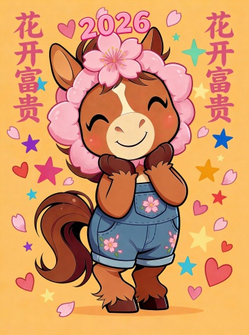 国潮风与拟人化马年主角结合,卡通感十足,喜庆红金配色搭配印刷风纹理,鎏金文字点缀,传递2026春节新禧的吉祥氛围。