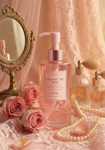 柔粉色调,轻拟物风瓶身搭配玫瑰与蕾丝,营造甜美浪漫的实景感,面料质感细腻,唯美感十足,传递优雅节日氛围。
