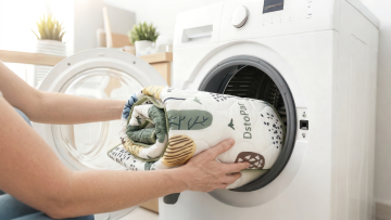 主体特征:一个外国女人(仅露出上半身及双手),正用银灰色蒸汽熨斗熨烫一块平铺在灰色熨衣板上的米白色布料,一手握住熨斗,一手轻按布料固定。场景环境设计:温馨的居家客厅场景,浅木色地板,背景可见浅灰色沙发与格纹抱枕,左上角摆放一盆白色花盆种植的小型绿植。艺术风格:写实生活风,画面质感柔和自然,呈现治愈、舒适的居家氛围。构图视角:正上方俯拍视角,熨衣板与人物主体位于画面中心,周围环境元素作为背景点缀,画面布局均衡。