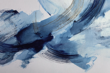 抽象水彩风格画作,整体以深蓝色与米白色为主要配色,保留原作中粗犷奔放的笔触质感与自然流动的色块交融效果,画面上方是大面积深邃的靛蓝色块,边缘带有柔和的晕染过渡,下方则是明亮的米白色区域,通过横向的、带有明显肌理感的笔触营造出类似水面反光的视觉效果,色彩层次丰富,从深蓝到浅蓝再到米白自然渐变,整体氛围宁静而富有艺术张力,展现出独特的色彩纹理和抽象美感。