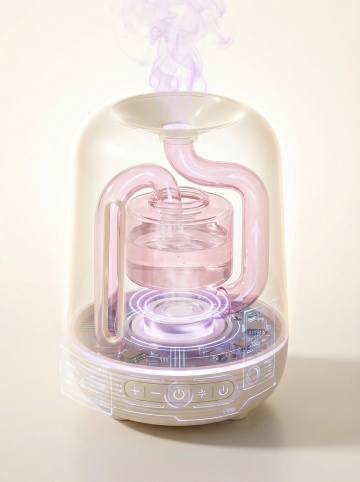 现代简约风加湿器,3D渲染质感,玻璃桌面倒影清晰,蓝紫渐变光影营造未来科技感与清透柔和氛围,轻拟物设计突显舒适生活美学。