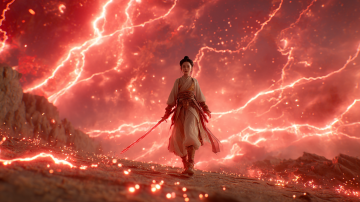 梦幻古典中式插画,仙人御剑飞行,云海缭绕,水墨风格渲染虚拟现实。