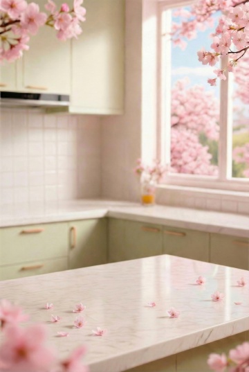 梦幻3D风,虚拟自然场景,甜美浪漫的樱花窗前,花瓣飘落,营造温馨氛围。