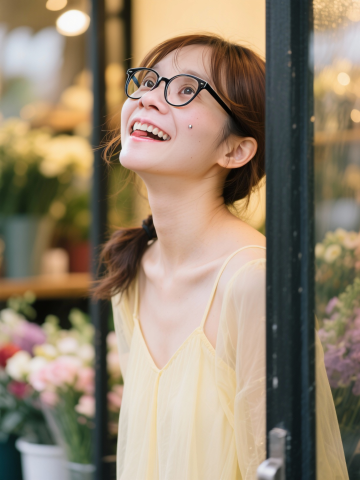 清新柔和的胶片风画面,少女在花店门口微笑仰望,光影斑驳,文艺唯美,充满东亚风情与浪漫温馨感。