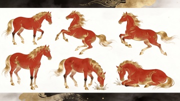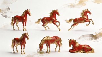 工笔风红金双色骏马,融合中式古典与鎏金水彩技法,喜庆祥瑞,尽显东方雅韵。