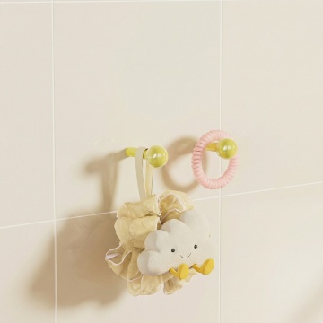 软3D风格的云朵造型沐浴球,拟人化笑脸设计,搭配奶油色面料与柔和色彩,营造可爱卡通感,适合儿童浴室场景。