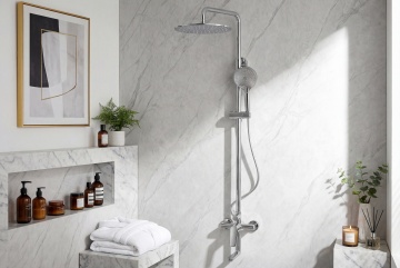极简主义风格卫生间,米白色调墙面与地面,柔和自然光,高光细腻的白色马桶,嵌入式米白色浴室柜配大理石台面,上方带LED灯的长条形镜面柜,壁挂式黑色金属毛巾架挂着白色毛巾,左侧透明玻璃淋浴房,柜内及台面摆放洗护用品,整洁有序的空间布局,简约现代的设计感,不同场景下的卫生间内部摆设,强调空间的通透感与收纳功能,干净利落的线条,舒适明亮的氛围