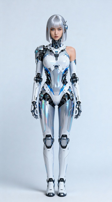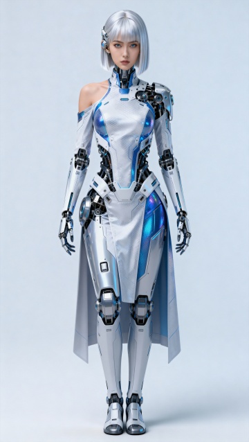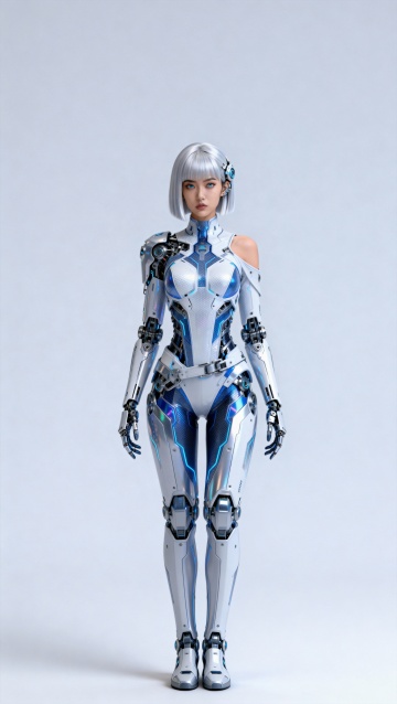 赛博朋克风机械女性,融合未来感与科技感,金属机身搭配霓虹灯背景,3D重拟物设计展现机能美学。