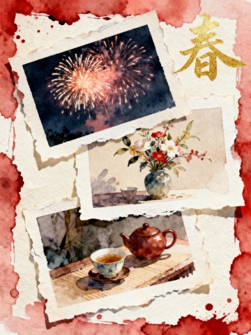 水彩风拼贴插画,撕纸边框点缀烟花、花艺与茶事,金“春”字点睛,融合中式复古与喜庆文艺,传递新春暖意。