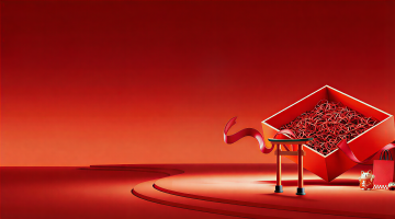 一个打开的红色礼盒,盒盖向两侧翻折,盒内涌出多个大小不一、装饰着金色缎带蝴蝶结的红色礼物盒和红色球形饰品,礼盒底部和周围散落着金色铃铛、红色花瓣和金色五彩纸屑,整体呈现出欢庆、惊喜的氛围,采用3D渲染技术,具有光滑的材质质感、明亮的高光和清晰的阴影,主色调为红色与金色的搭配,光线从上方照射,营造出立体感和华丽感,白色背景干净简洁,突出主体。
