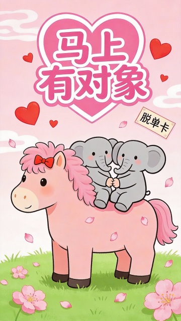 插画风卡通设计,粉嫩色系搭配拟人化小动物,大字风标题“马上有对象”置于爱心框中,传递甜蜜浪漫与趣味感,适合情人节主题。