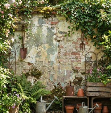 清新自然的庭院花园,柔和光影洒落石径,粉紫花簇与绿意交织,白绿长椅静谧相映,营造出唯美浪漫的文艺氛围,兼具实景感与视觉诗意。