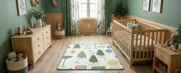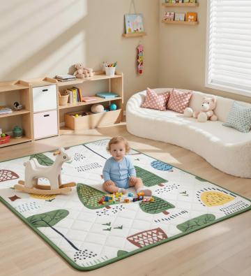 现代极简风格的客厅场景,以浅灰色调为主的现代家具布置,画面聚焦于铺在浅灰色瓷砖地面上的浅灰色条纹地毯特写,地毯表面有细腻的竖条纹纹理和柔软的编织质感,占据画面下方大部分区域;背景中可见浅灰色布艺沙发,搭配几个同色系的靠垫,沙发旁有一个圆形金属边框的小茶几,靠墙处有一个简约的灰色搁板,上面放置一个小型装饰画框;右侧是大面积的落地窗,透过轻薄的白色纱帘洒入明亮柔和的自然光,光线在地毯和地面上形成自然的光影过渡,窗外可见模糊的绿色植物,整体营造出宁静、整洁、高级的现代家居氛围,空间感开阔,线条简洁,色彩统一和谐,具有清晰的视觉层次和舒适的居住感。