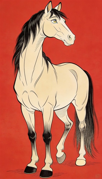 复古感与古典感交织,白描风线条勾勒出骏马的优雅轮廓,版画风格强化质感,插画风呈现文艺气息,红底衬托出节日喜庆氛围。