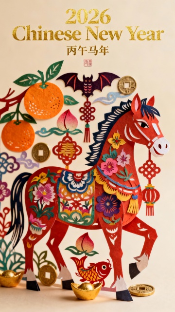 剪纸风与拼贴艺术融合,红马饰以国潮花纹,搭配金元宝、灯笼与祥瑞元素,营造喜庆中式氛围,展现丙午马年节日祝福。