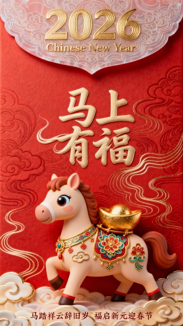 软3D风卡通马载金元宝,鎏金文字搭配浮雕云纹,喜庆红底衬托刺绣质感,萌趣可爱中尽显传统年味。