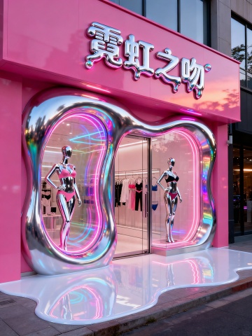 赛博朋克风3D建筑,霓虹灯点缀,金属质感搭配几何图形,未来感十足的虚拟现实潮流店铺,梦幻与科技交融。