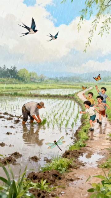 水彩风插画,清新质朴的春日田园,雨中插秧与孩童嬉戏交织,传递温馨故事感,燕子飞舞,蝶影翩跹,尽显自然生机。