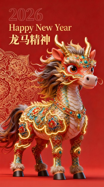 3D国潮风龙马,鎏金浮雕细节,重拟物设计,融合中式纹样与金属光泽,喜庆红金配色,传递2026新年龙马精神。