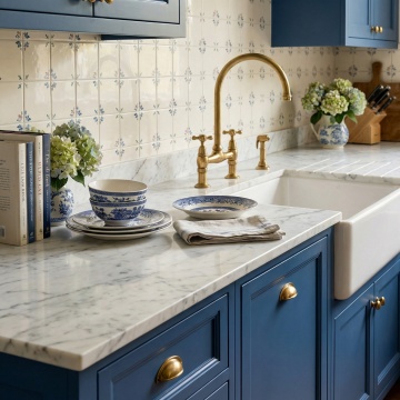 现代简约风格厨房,白色大理石台面搭配浅灰色橱柜,黄铜色五金件点缀,自然光透过百叶窗形成光影条纹,窗台下是双槽黄铜水龙头水槽,右侧台面摆放不锈钢桶(内含木质锅铲)、金属挂杆悬挂木柄厨具,上方白色搁板陈列玻璃罐调料和金属储物罐,台面上有一盘三明治和水果沙拉,整体干净明亮、整洁有序,营造温馨实用的烹饪空间氛围。