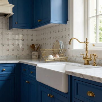 一个明亮整洁的现代厨房,采用简约优雅的设计风格,以白色为主色调,搭配黄铜色金属装饰细节。厨房整体呈现出温馨舒适的氛围,阳光透过百叶窗洒入,在白色橱柜和大理石台面上形成柔和的光影效果。白色的橱柜带有黄铜色的圆形拉手,上方的吊柜和下方的地柜组合提供了充足的储物空间。大理石台面光滑洁净,带有自然的灰色纹理。台面上有一个双槽不锈钢水槽,搭配黄铜色的水龙头。水槽旁边的金属桶里插着木质的锅铲和汤勺。墙面安装着黄铜色的挂杆,上面挂着各种木质和金属材质的厨房用具,包括勺子、铲子等。挂杆上方的白色搁板上摆放着不锈钢和玻璃材质的储物罐,里面装着各种香料和食材。台面上还摆放着一个白色的盘子,里面放着几块叠在一起的三明治,旁边还有一盘色彩鲜艳的沙拉。整体构图采用了三分法,光线从左侧窗户进入,营造出明亮通透的感觉,细节丰富,质感细腻,展现出干净利落的现代厨房设计感。