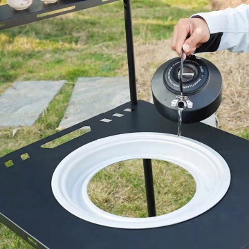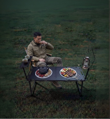 工业风户外灶具,金属质感搭配橙色点缀,科技感火焰显示与光影交织,展现现代机能美学与质朴野营场景的融合。