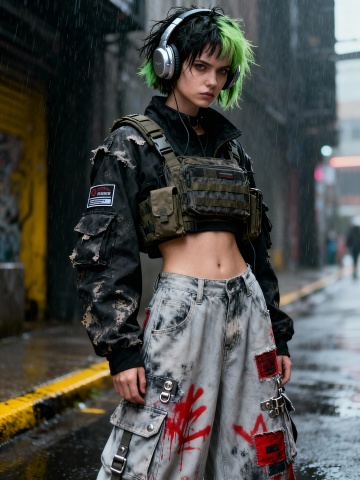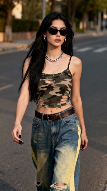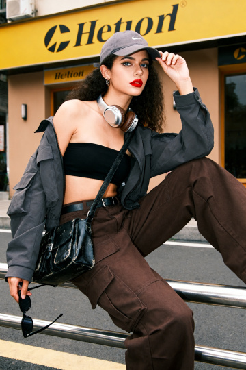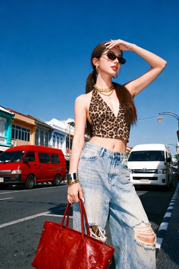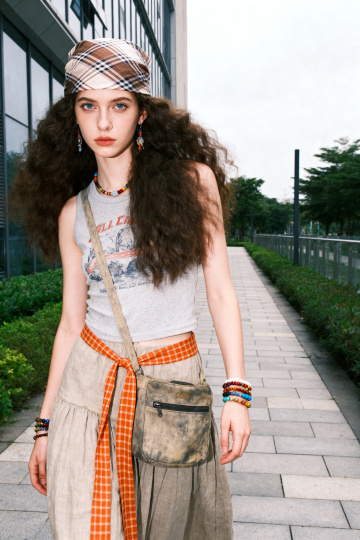 低饱和粉色纹理渐变背景,女人(紫棕纹理吊带搭配蓝色半身裙,粉色中筒靴,千禧年配饰,玫红色复古腋下包)动作舒展。看镜头。