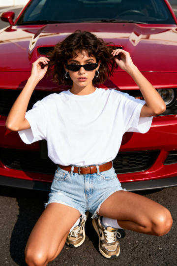 人物朝向右前方以放松且带有时尚感的姿态坐在粉色折叠椅上,椅子朝向正右方,右脚自然的踩在椅子边缘,右手臂自然的搭在膝盖上,左腿坐姿自然,左手拿着折起的晴雨伞悬于身前,整体姿态随性又有镜头感,既展现松弛感,又突出了手中的晴雨伞产品。她头部微侧,眼神透过墨镜看向镜头斜上方,表情清冷又带点酷感,没有夸张的表情,通过红唇和松弛的神态营造出高级、慵懒的时尚氛围,符合当下极简潮流的审美。