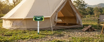 阳光透过茂密的绿色树叶洒下斑驳光影,在开阔的绿色草地上,布置着一个米色帆布帐篷和一个带遮阳棚的露营帐篷,帐篷周围摆放着原木色折叠桌椅,桌上铺着格纹餐布,旁边散落着几个彩色靠垫和一本翻开的书,整体呈现出自然、宁静、舒适的户外露营氛围,高清晰度,写实风格,温暖色调,柔和光线,丰富的细节纹理。