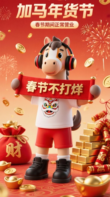 3D拟人金马身着中式服饰,置身传统市集摊位,搭配鎏金字体与金属质感装饰,融合喜庆红金配色与卡通元素,营造浓厚春节氛围。