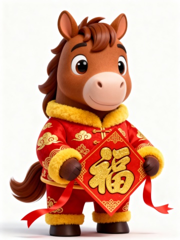 软3D风格的拟人小马,身着国潮风唐装,手持“福”字春联,融合可爱与卡通感,传递浓厚喜庆氛围。