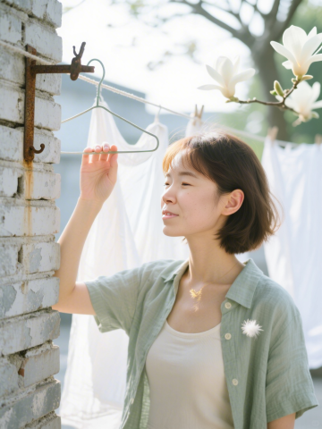清新自然的东亚风庭院场景,柔和光影中女子轻抚衣架,白布随风轻扬,玉兰花枝点缀,文艺唯美,尽显舒适与实景质感。