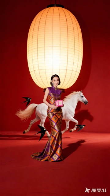 中式复古风,红金刺绣旗袍搭配鎏金马具,手持灯笼,尽显国潮奢华与优雅喜庆之美。