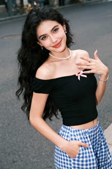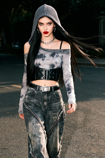 热闹的千禧年上海街头,女人(戴条纹头巾,豹纹高领坎肩,深色牛仔工装裤搭配帆布鞋,千禧年时尚配饰)走在街头。大光圈虚化背景。正面看镜头。