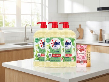 清新自然的厨房场景,水彩风与轻拟物设计融合,果蔬环绕天然呵护洗洁精,传递清爽舒适感,实景感十足,突出健康生活理念。
