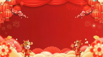 扁平风剪纸风格,融合拟人化财神与舞狮红包,喜庆卡通元素传递春节祝福。