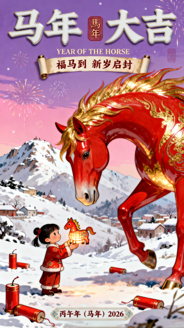 马年瓷板画,红马与童子共庆马年,鎏金文字与雪景交融,烟花绽放,喜庆梦幻。