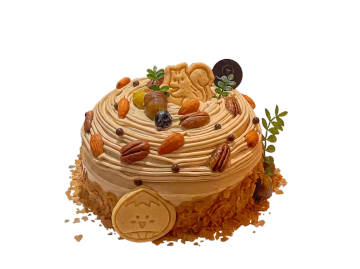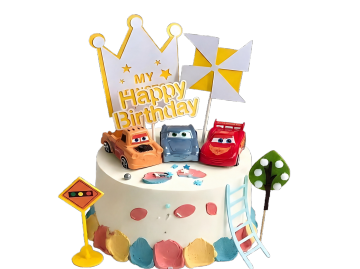 一个三层的生日蛋糕,底层为深棕色,中层为暖黄色,顶层为淡紫色,每层都覆盖着光滑的奶油,奶油边缘呈波浪状,上面点缀着彩色的糖屑和金色的星星装饰。蛋糕顶部有一个银色的皇冠,皇冠上镶嵌着紫色的宝石,周围摆放着紫色的葡萄和粉色的花朵。蛋糕周围有彩色的丝带和金色的星星装饰,背景为纯白色。