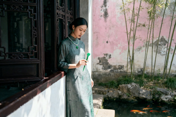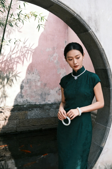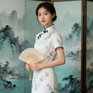 工笔风刺绣旗袍,水墨山水屏风映衬,古典优雅,文艺气息浓厚,尽显中式美学韵味。