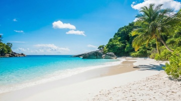 清澈透明的海水环绕着光滑的白色沙滩,阳光洒在海面上闪烁着金色的光芒,远处是蔚蓝的天空和几朵悠闲的白云,海浪轻轻拍打着岸边的礁石,溅起晶莹的水花,整体呈现出明亮、清新、宁静的夏日海洋氛围,具有高清晰度的写实质感和柔和的光影效果。