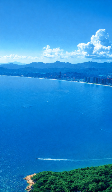 一片纯净无垢的广阔海洋,海水呈现出由近及远逐渐加深的透亮蓝绿色,清澈见底,能看到水下隐约的光影波动和细小的气泡。天空湛蓝如宝石,漂浮着形态各异的白色云朵,部分云朵边缘泛着淡淡的光晕,阳光明媚,光线充足,整个画面营造出宁静、开阔、清新自然的氛围,没有任何水印和文字干扰。