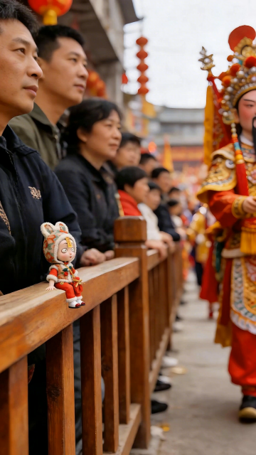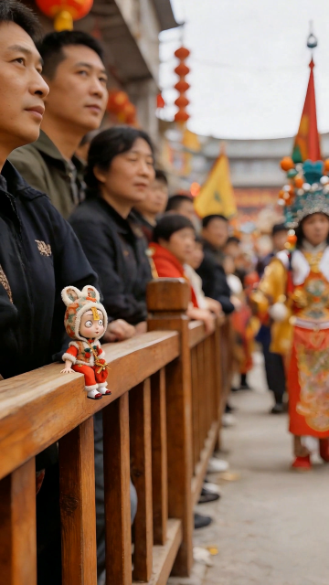 软3D国潮风,毛发生长质感卡通人物,雪夜庙会喜庆场景,糖葫芦摊与舞狮互动,温馨趣味十足,春节氛围浓郁。